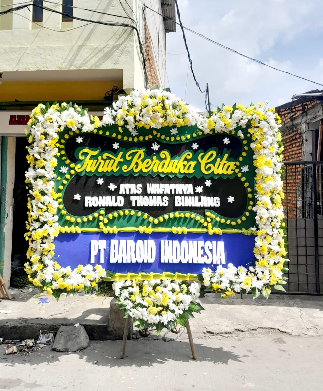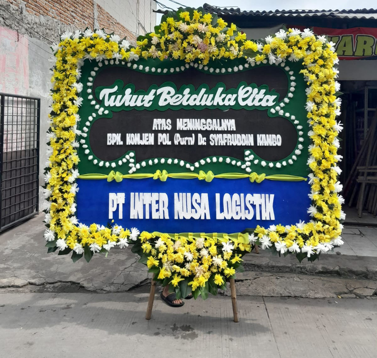 Desainnya yang penuh dan megah menjadikan Papan Bunga Abadi pilihan yang sangat tepat untuk ucapan duka cita formal. Sangat ideal untuk dikirimkan sebagai perwakilan perusahaan, instansi, maupun untuk menghormati tokoh masyarakat atau pejabat tinggi. Perpaduan bunga segar berwarna kuning dan putih di atas dasar papan yang gelap menciptakan kontras yang elegan dan memastikan tulisan mudah dibaca.